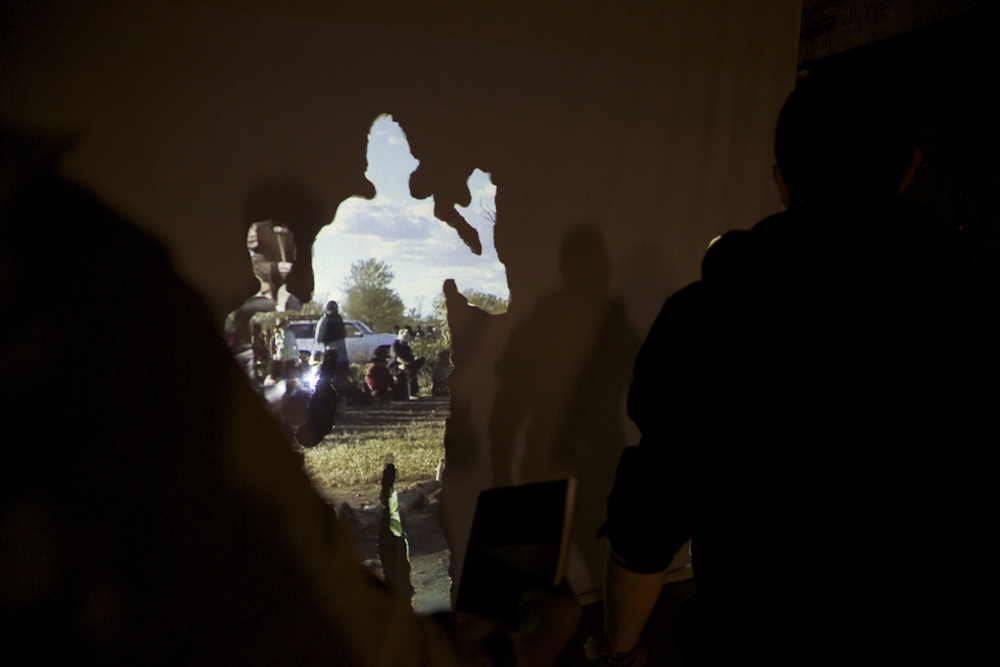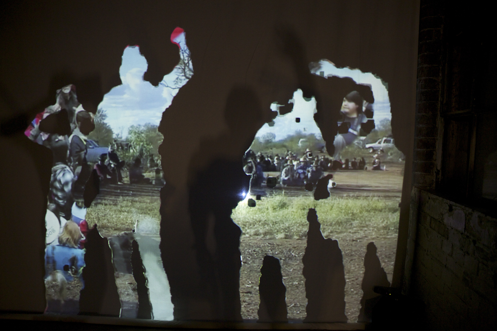 The Protest installation layers six global protest videos. Visitors must use their own bodies to carve into the layers to make the content visible, thus metaphorically joining the protests. Photo by Rita Leistner.