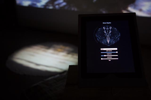 Water installation, responds to sound and the iOS app allowing control of water pools, including the brightness, symmety, and sensitivity of the water ripples to sound.