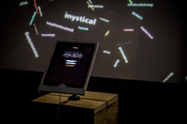 The WordMap installation in Room 12, by Rob Scharein. Visitors send word responses from the EcoCentrix iOS app, as they explore the four floors of the exhibition.