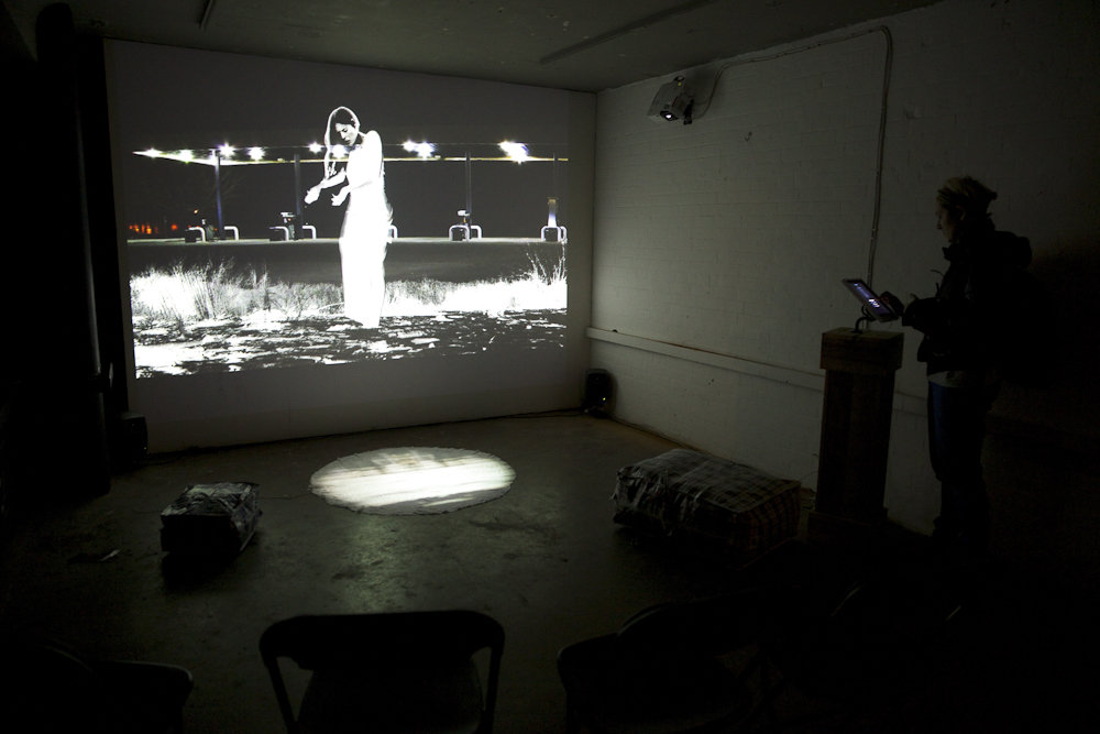 Visitors walking into an infra red camera view, revealed video of protests from around the world, inside the shape of their own re-projected body. Multiple visitors could join up & work together with their bodies in order to create a larger shape that would reveal more of the video image. Approaching the screen (metaphorically engaging more deeply in the protest) resulted in deeper video layers being revealed, (6 layers in total), until they reached a video showing the use of tear gas and physical repression by soldiers. (More photos in the gallery above)