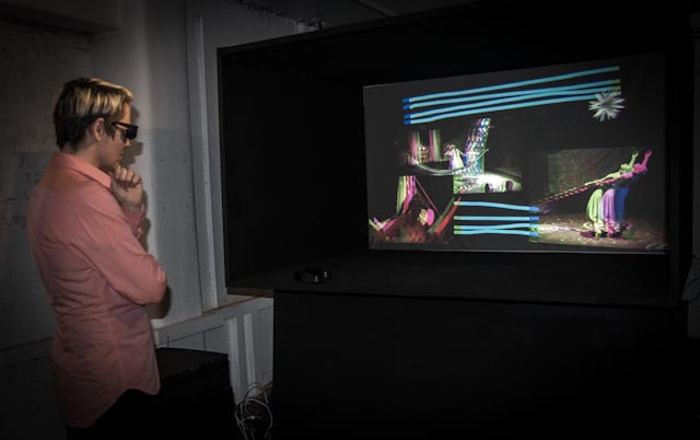 The tabletop theatre box uses a technique called active stereo 3D, custom software called Video Orb, and Isadora software for control of the content. When projected in 3D and viewed through the glasses provided, the theatre’s back wall stretches away to infinity, allowing multiple video screens for playback of performance footage to be placed in a 3D cyber-theatre. Photographs, video content, and 3D objects can be programmed remotely.