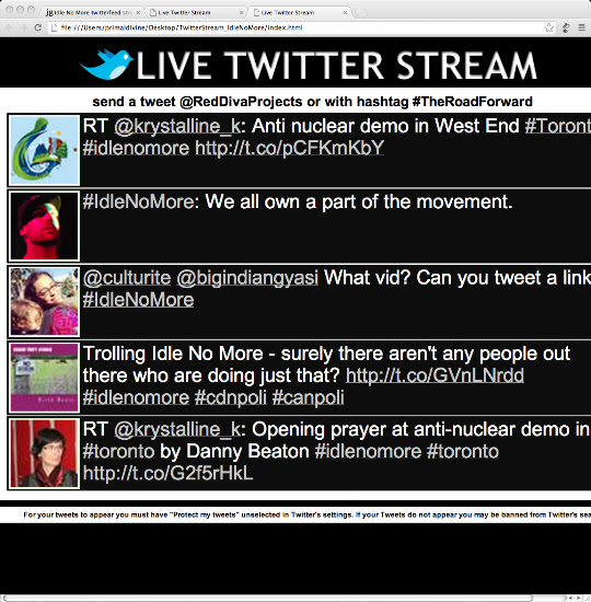 I put this live twitter feed file together for a first nations music concert. You can download it and run it on any browser software. It will refresh 'idle no more tweets', live.