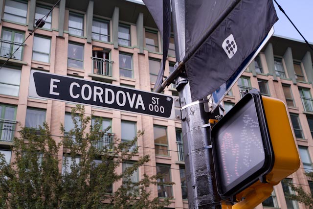 I look up to check the address. East Cordova Street. 000