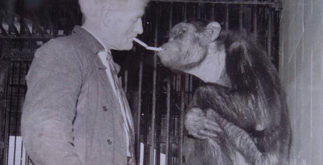 “ A captive chimpanzee enjoys a cigarette