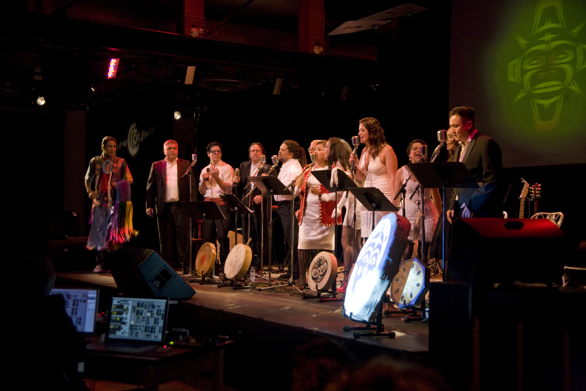 "This evening’s sold out performance is entertainment at its best. I was impressed by the variety in the show. There is the colourfully attired native dancer in traditional native dress who dances right around the perimeter of the audience, musicians, singers and 3D images. The audience is made a part of the production simply by having the dancer in the audience and drummers who enter from the back of the theatre. 3D glasses were passed out to the audience individually while 3D native images appeared on the screen at the back of the stage." 'The Road Forward' PuSh International Festival. Review Vancouver, Karen Fitzgibbon